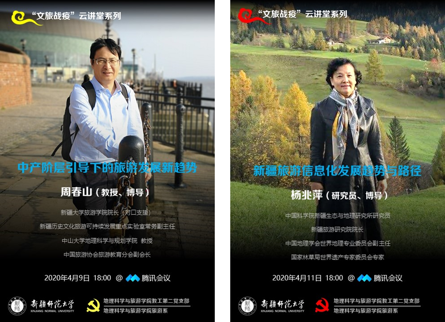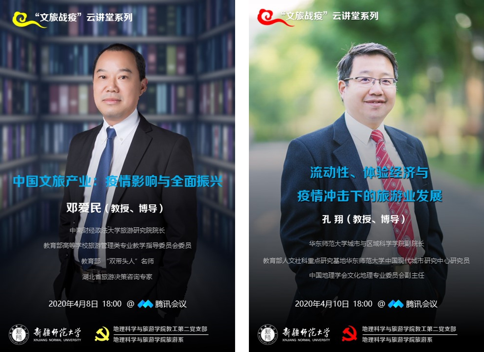 对于高校教师、学生而言,做好疫情期间的教育教学工作。科学落实停课不停学,把疫情对学生对教学的影响降到最低,必赢76net线路官网教工第二党支部和旅游系结合专业特色发起了“文旅战疫”云讲堂活动,邀请文旅大咖从不同的视角为旅游管理专业师生解读“战疫”之后文旅产业的应变之道。应邀参加此次活动的专家有中南财经政法大学旅游研究院院长、教育部“双带头人”、教育部高等学校旅游管理专业教学指导委员会委员邓爱民教授;新疆大学旅游学院院长、新疆历史文化旅游可持续发展重点实验室常务副主任、中国旅游协会旅游教育分会副会长周春山教授;华东师范大学城市与区域科学学院副院长、教育部人文社科重点研究基地研究员、中国地理学会文化地理专业委员会副主任孔翔教授和新疆旅游研究院院长、国家林草局世界遗产专家委员会专家、中国科学院新疆