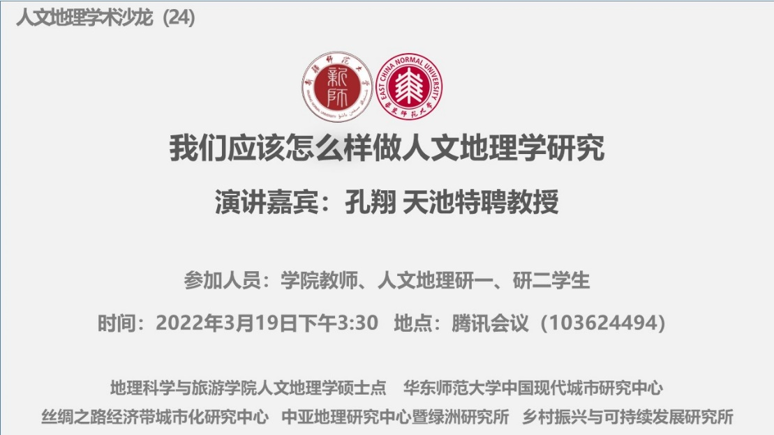 2022年3月19日下午3:30,必赢76net线路官网举办的第24期人文地理学术沙龙在线上召开。此次学术沙龙由学院黄佛君副教授主持,华东师范大学城市与区域科学学院的孔翔教授,作《我们应该怎样做人文地理学研究》主题讲座。孔翔教授用深厚的学术底蕴和研究阅历,希望引领新必赢地科院年轻教师和研究生走进人文地理学的研究。